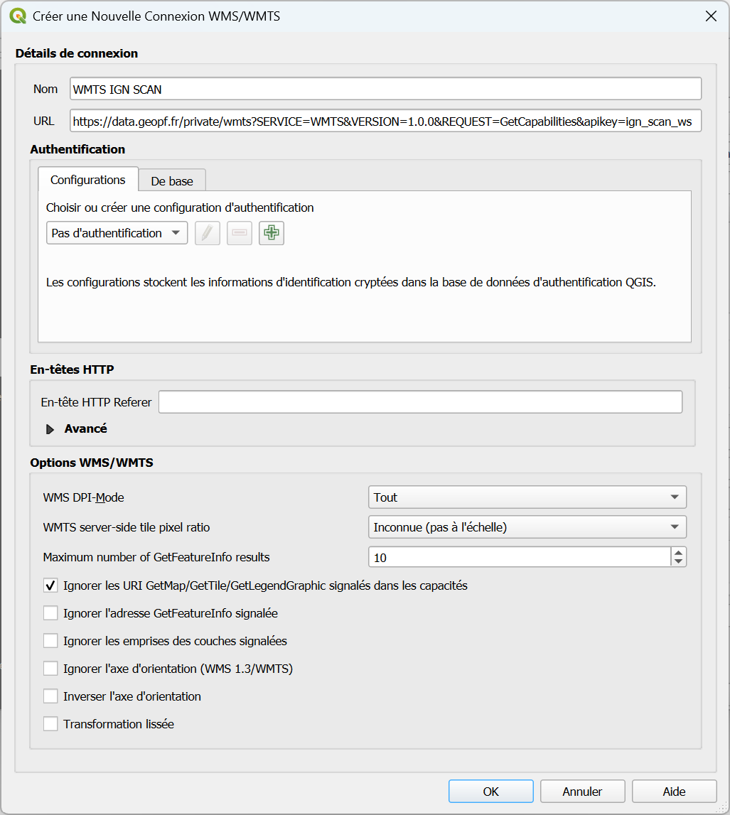 - Cocher la case "Ignorer les URI GetMap/GetTile/GetLegendGraphic signalés dans les capacités"